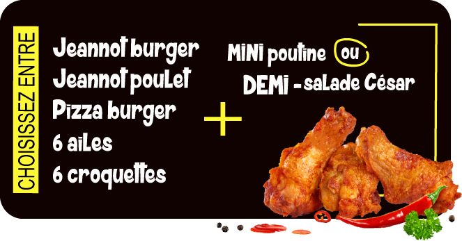 Choisissez entre le Jeannot burger, le Jeannot poulet, la pizza burger, 6 ailes ou 6 croquettes plus une mini poutine ou une mini-salade César pour 18,25$.