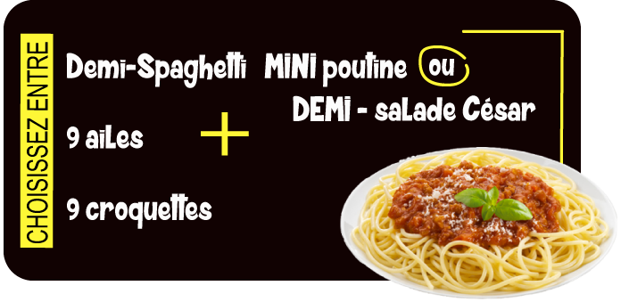 Profitez de ce combo en chosissant entre le demi spaghetti à la viande, 9 ailes ou 9 croquettes plus une mini poutine ou une mini-salade César pour 19,99$ .