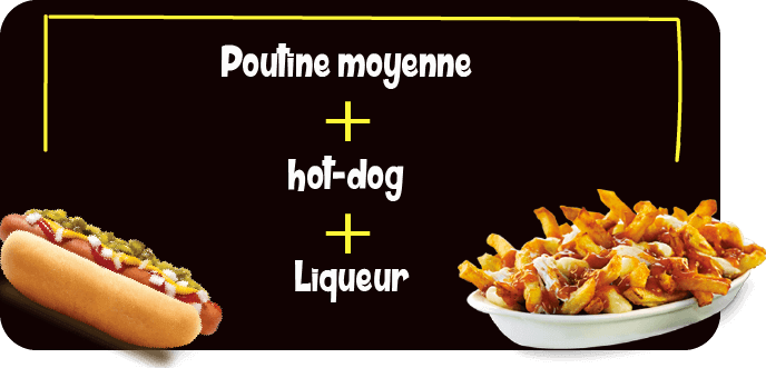 Forfait trio hot-dog : une poutine moyenne plus un hot-dog plus une liqueur pour seulement 17,69$.