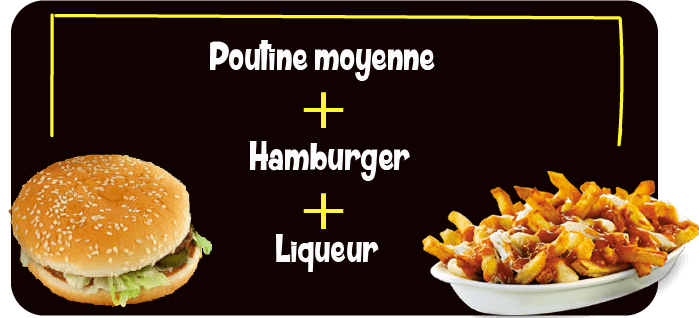 Forfait trio hamburger : une poutine moyenne plus un hamburger plus une liqueur pour seulement 18,95$.