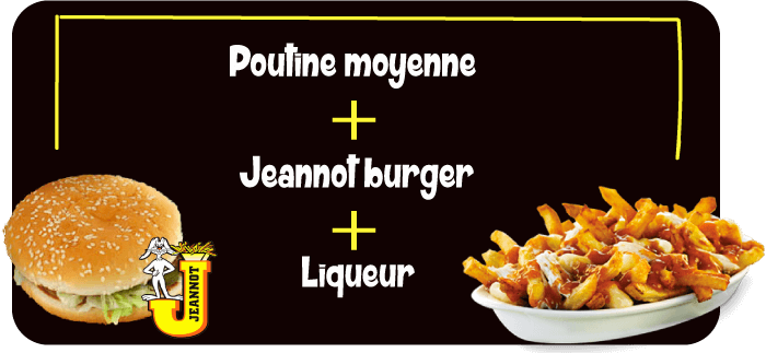 Forfait trio Jeannot burger : une poutine moyenne plus un hamburger spécial «Jeannot» plus une liqueur pour seulement 21,69$.